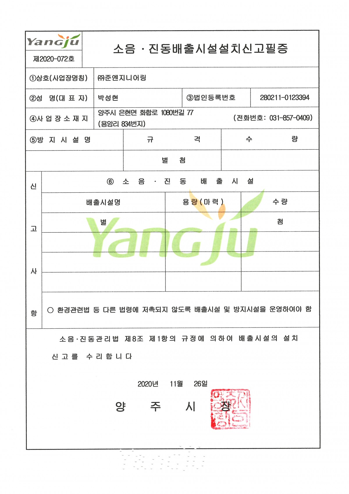 Noise and Vibration emission facility installation report certificate 페이지 정보 Writer 최고관리자 Date Created21-04-15 14:26 Lookup1,074 comment0 관련링크 이전글 다음글 List answer 본문 . 댓글목록 등록된 댓글이 없습니다. 이전글 다음글 List answer